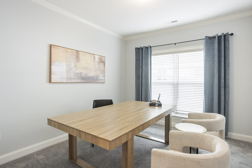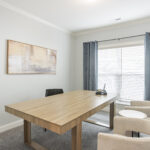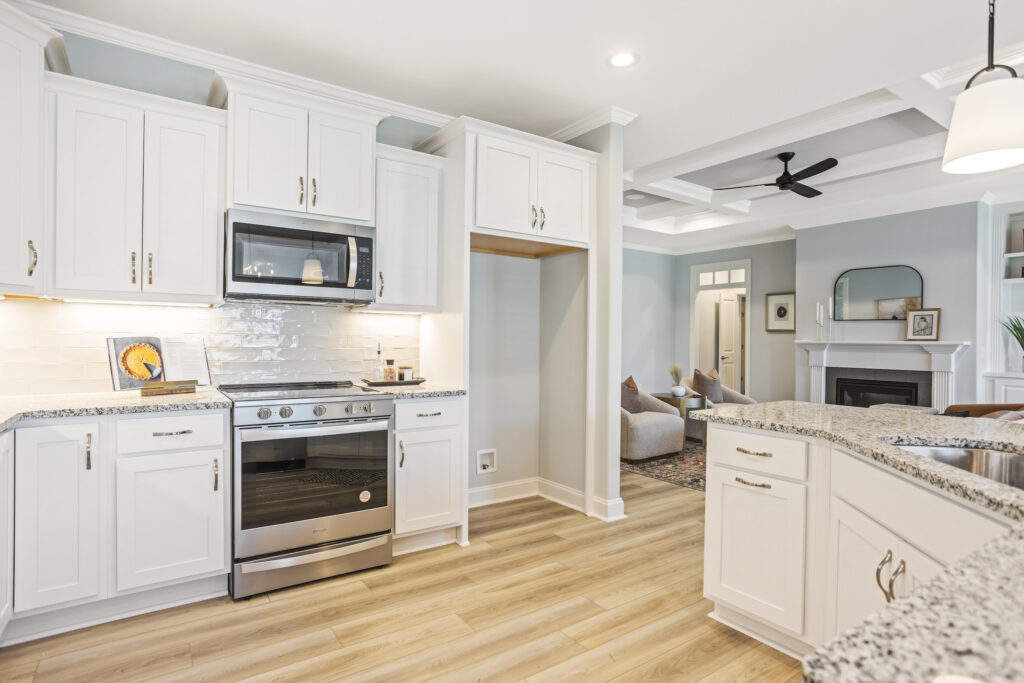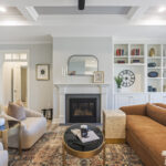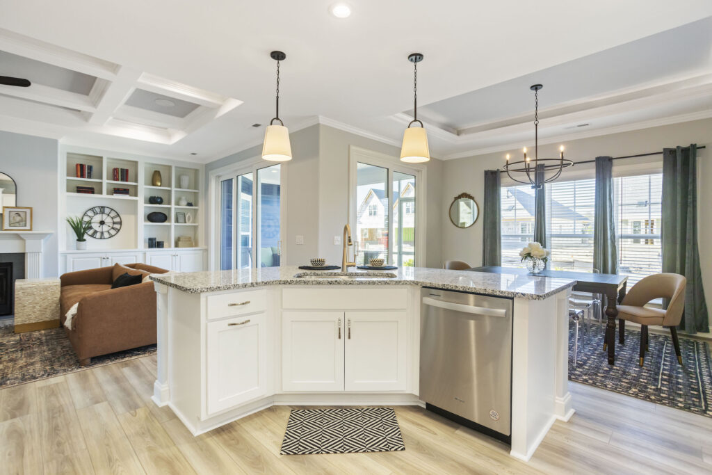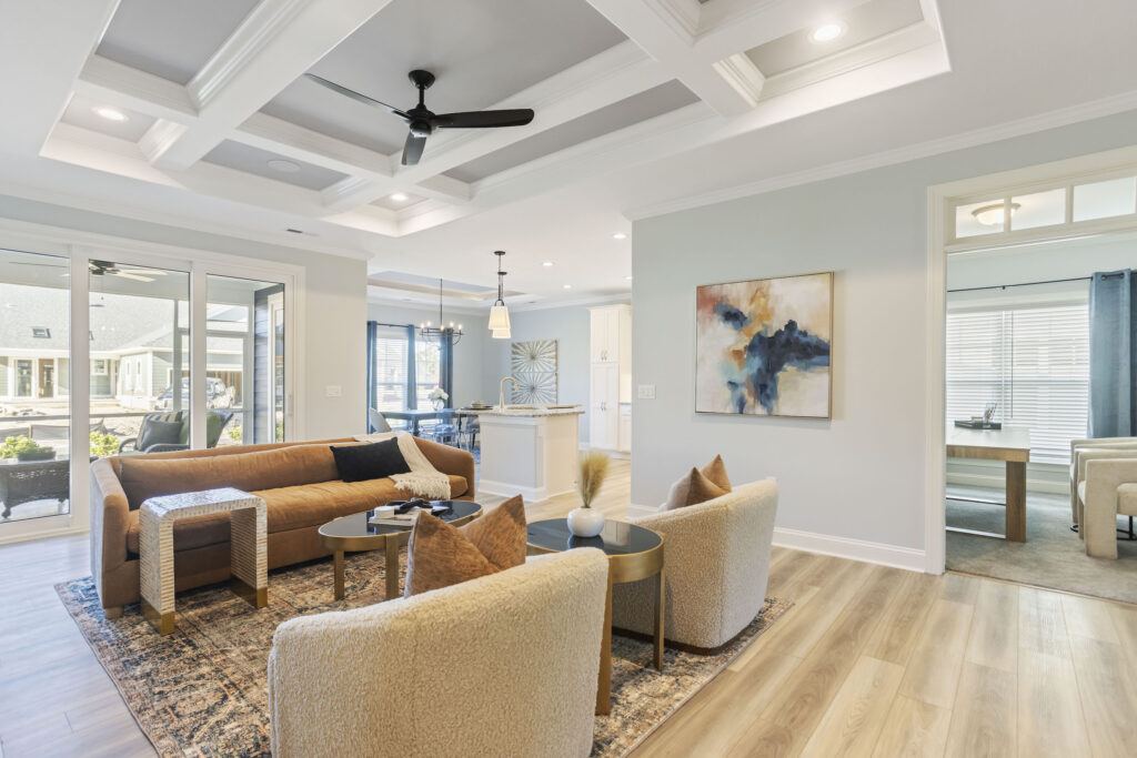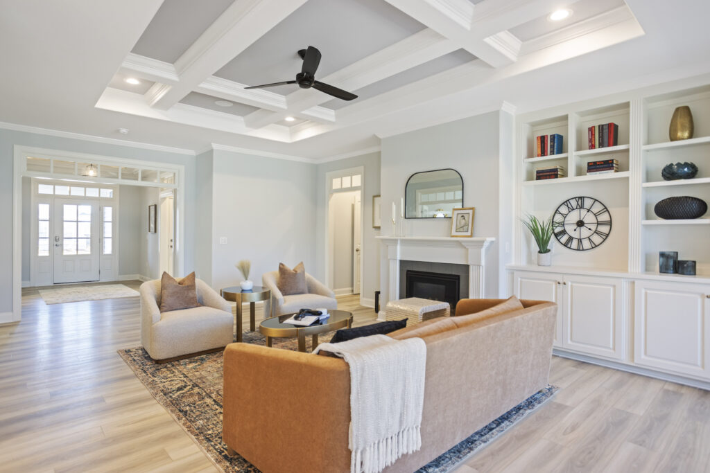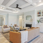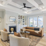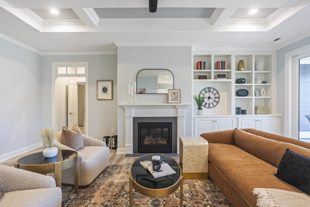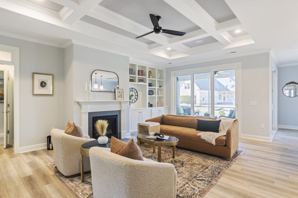 - Family room features built-ins, coffered ceiling and gas fireplace