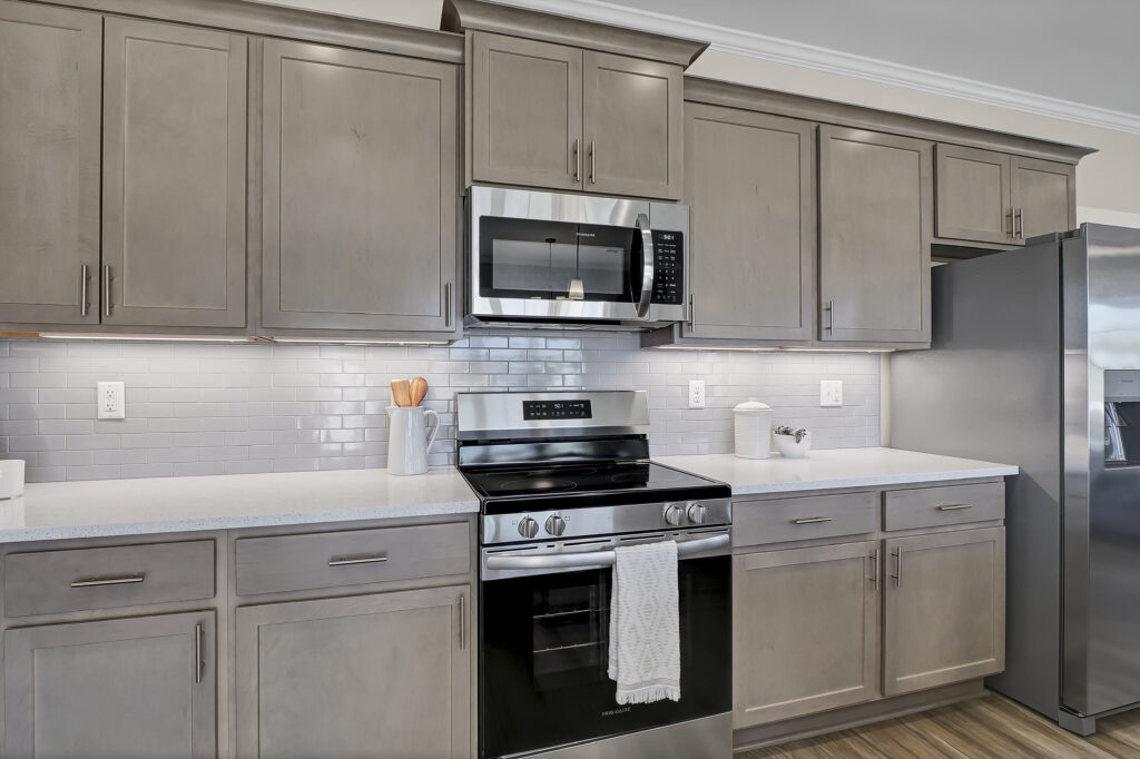 - Quartz Countertops, Kitchen Tile Backsplash, and Pendant Lights