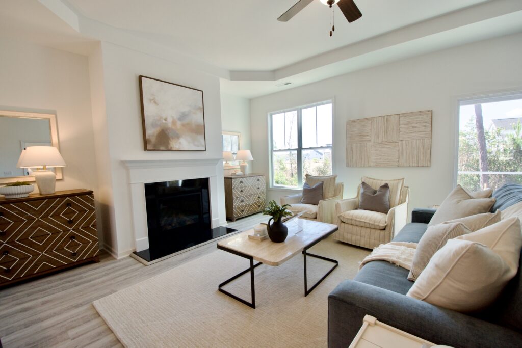 - Cozy and inviting fireplace with gas logs and granite surround.
