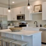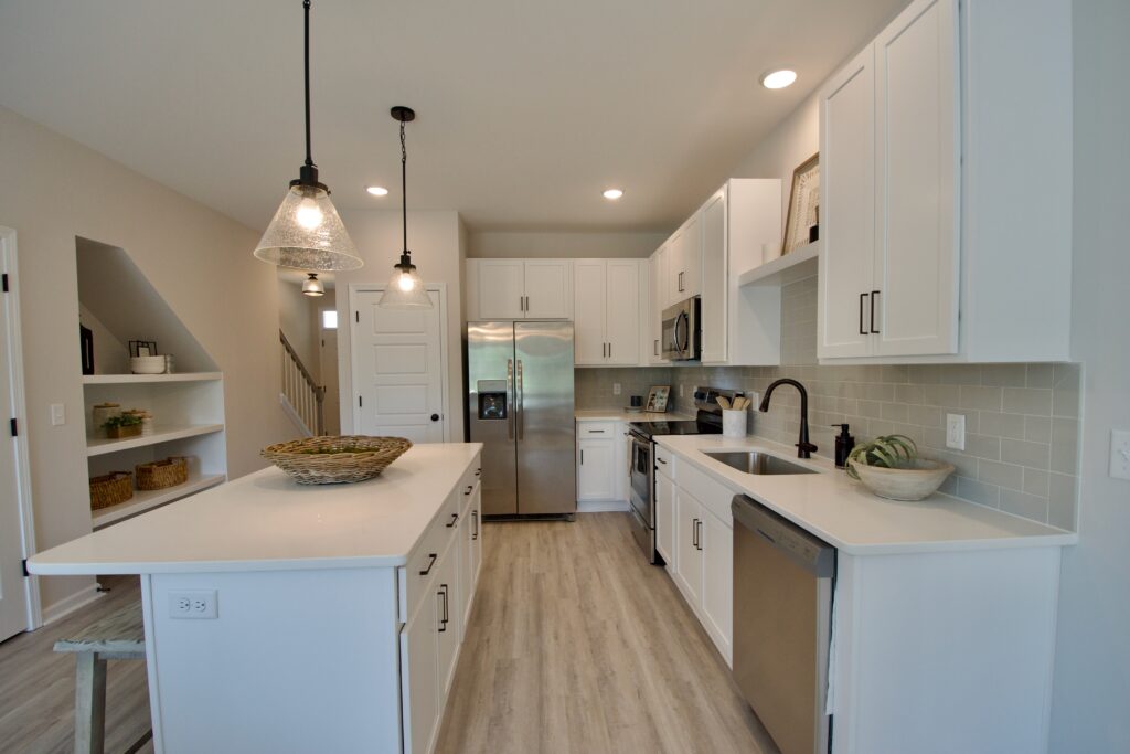 - Stainless steel Frigidaire appliances and seeded glass pendant lights in kitchen.
